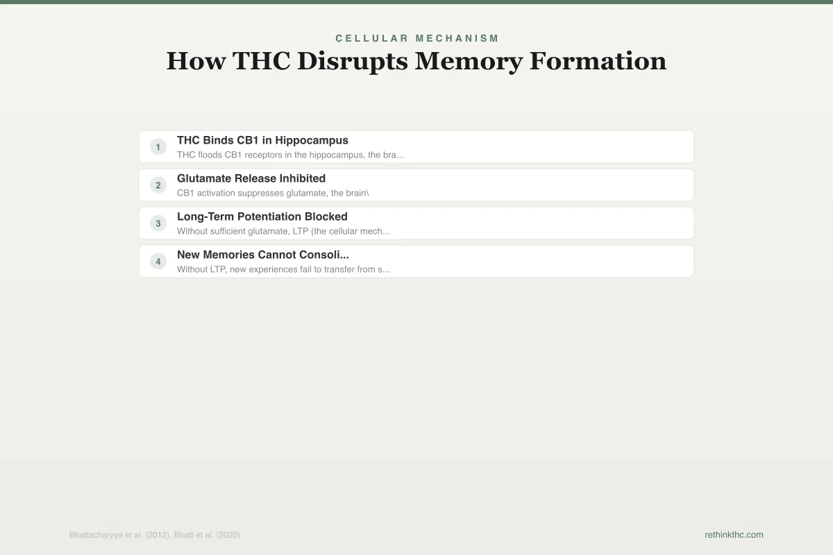 This process is reversible. When THC clears and CB1 receptors recover, glutamate signaling normalizes and LTP resumes. Memory encoding returns to baseline.