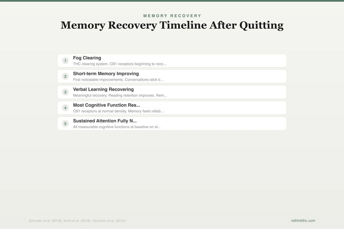 Days 7 to 14. Meaningful improvement for most people. Reading retention gets better. Conversations stick. You remember what you needed at the grocery store without a list. People in cannabis recovery communities frequently describe this phase as "the lights coming back on."