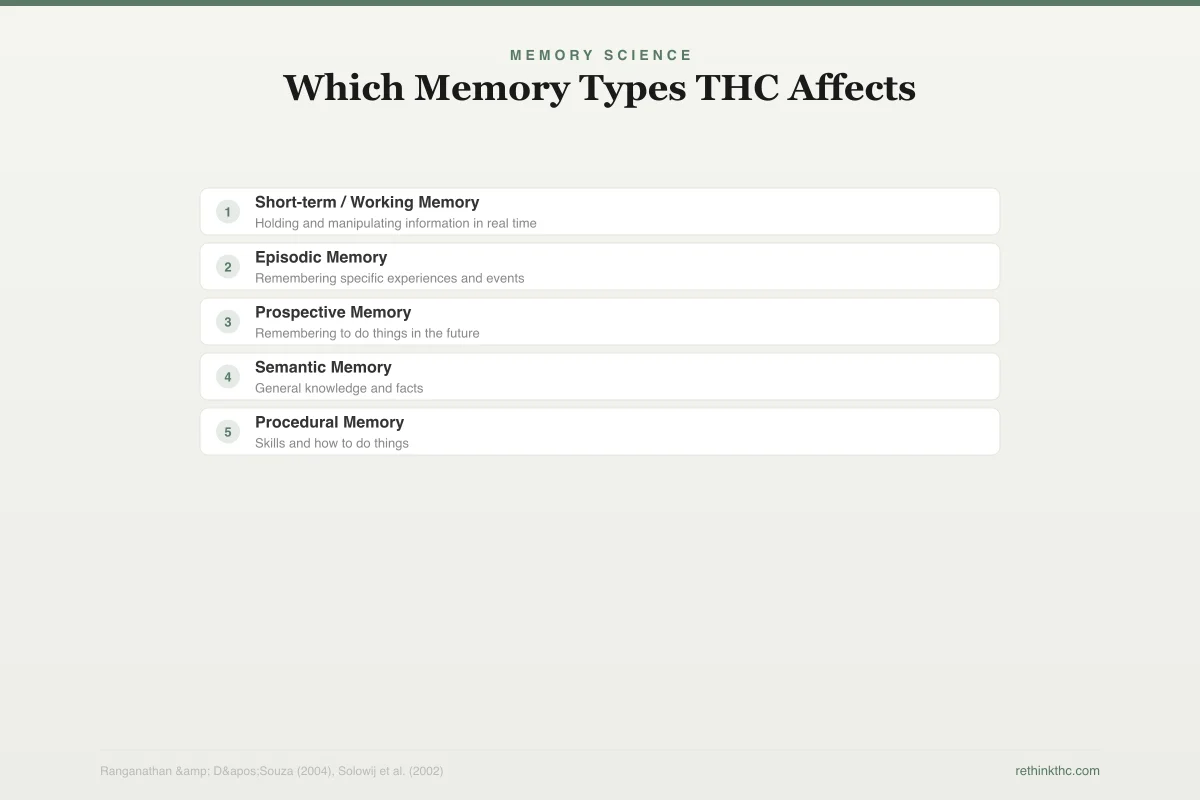 A 2004 review by Ranganathan and D'Souza, published in Psychopharmacology, documented that acute THC administration consistently impairs verbal learning, short-term recall, and working memory across dozens of controlled studies. The effect is temporary. Once THC clears your system, your ability to form new memories returns to baseline.