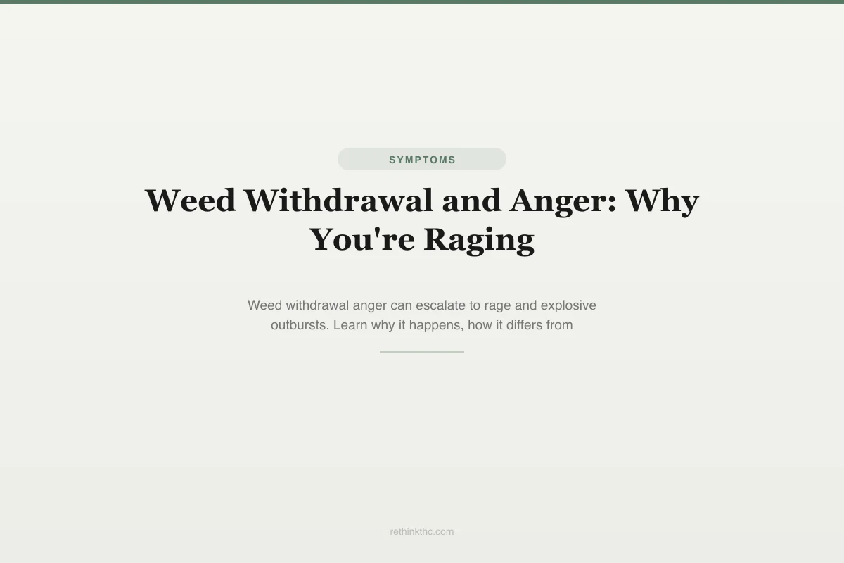 - Weed withdrawal anger is not the same as irritability — irritability is a lowered threshold for frustration, while rage is an explosive, disproportionate response that can feel violent and unfamiliar