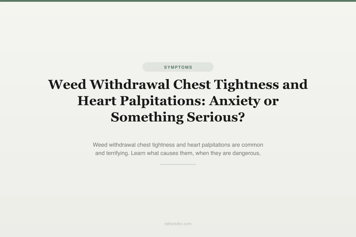 View as imageYour chest is tight. Your heart feels like it is skipping beats or pounding too hard. You are lying in bed wondering if you should call 911 or if you are overreacting. You stopped smoking a few days ago, and now your body is doing things that feel genuinely dangerous. If you searched for weed withdrawal chest tightness heart palpitations at 2 a.m. because you are scared right now, this article is for you. What you are feeling is almost certainly withdrawal. But you deserve to understand exactly why it is happening, what makes it different from a real cardiac event, and the specific situations where you should get to an emergency room immediately.