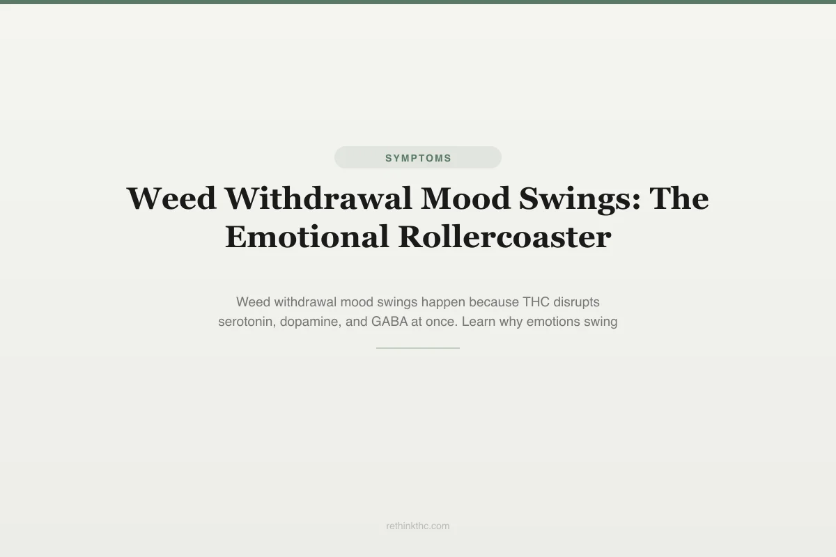 View as imageYou were fine 20 minutes ago. Now you are on the verge of tears for no reason you can name. By tonight you will probably be irrationally annoyed at someone you love, and by tomorrow morning you might wake up feeling oddly optimistic before it all crashes again. If you are experiencing weed withdrawal mood swings, the most disorienting part is not any single emotion. It is the speed and randomness of the shifts. You feel like you cannot trust your own reactions, and you are right to be confused, because your brain is currently recalibrating three major chemical systems at the same time.