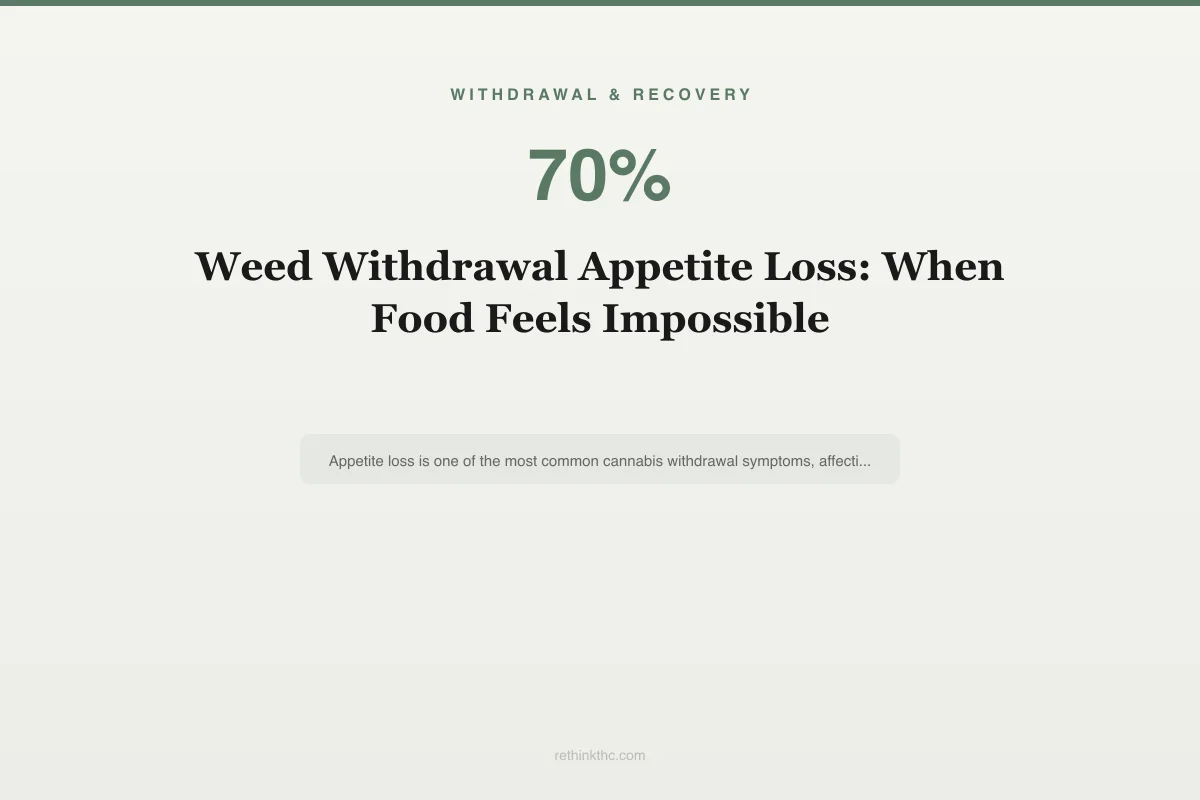 Appetite loss during cannabis withdrawal affects up to 70% of daily users and is caused by CB1 receptor recalibration in the hypothalamus, the brain's appetite control center. THC was directly stimulating hunger signals, enhancing food's sensory appeal via the olfactory bulb, and altering ghrelin (hunger hormone) production. Withdrawal appetite suppression typically begins days 1 to 3, is worst during days 3 to 7, and improves by the end of week 2. Nausea compounds the problem through CB1 receptor disruption in the gastrointestinal tract. CB1 receptors begin recovering within 2 days and normalize by day 28, but appetite shows meaningful improvement before full recovery. Practical management includes smoothies, broth, bland starches, frequent small portions, and prioritizing hydration. Significant weight loss beyond 5% of body weight, inability to keep liquids down, or symptoms lasting beyond 3 to 4 weeks warrant medical evaluation.