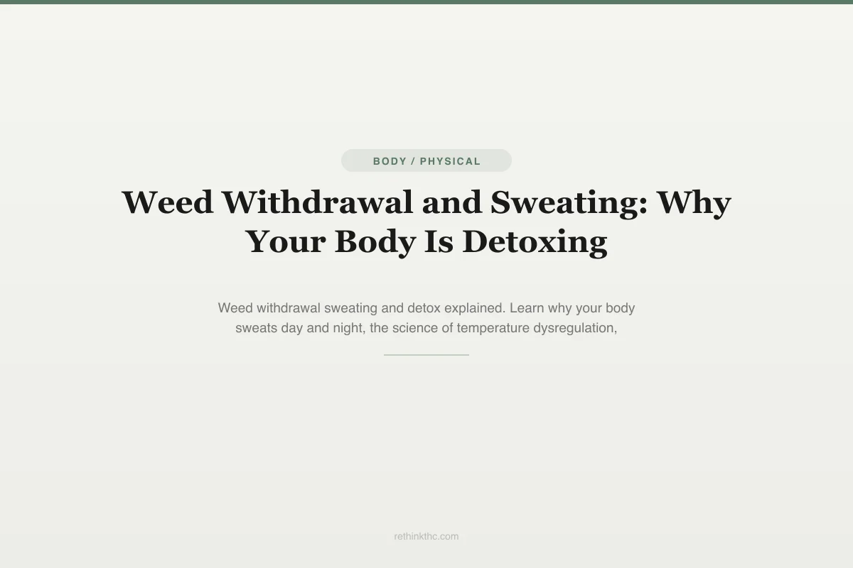 Weed withdrawal sweating results from two overlapping processes: autonomic nervous system recalibration and physical THC elimination. Primary mechanism: hypothalamus relies on CB1 receptor signaling (densely concentrated in this brain region) to regulate body temperature (2007 Pharmacology and Therapeutics). Chronic THC use integrates into thermoregulatory baseline; upon cessation, hypothalamus overshoots/undershoots while relearning independent function. Affects both daytime (clammy palms, unexpected flushing, sweating in mild temperatures) and nighttime (more intense due to natural temperature drop during sleep triggering misfires). Secondary mechanism: THC is fat-soluble, accumulates in adipose tissue over months/years. Upon cessation, stored THC mobilized from fat, processed by liver/kidneys, and partly eliminated through sweat glands (Journal of Analytical Toxicology confirmed THC metabolites detectable in sweat). Longer use histories / higher body fat = more stored THC = potentially longer sweating. Timeline: days 1-3 onset, days 4-7 peak intensity (overlaps acute withdrawal), weeks 2-3 significant improvement as hypothalamic recalibration completes, week 4+ resolved for most (residual episodes in heavy users from tail-end THC clearance). Management: hydration (fluid loss through sweating compounds fatigue/headache/irritability), breathable moisture-wicking fabrics, cool environment, light-moderate exercise (mobilizes stored THC faster), avoid alcohol (disrupts thermoregulation) and afternoon caffeine. Red flags: high-intensity sweating beyond 4 weeks, fever, unexplained weight loss → evaluate for thyroid/infection/hormonal causes.