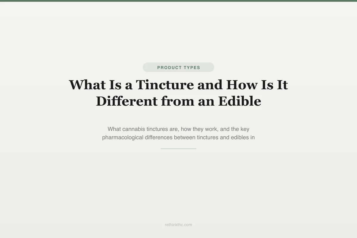 Comprehensive tincture vs edible comparison covering pharmacology, dosing, and practical use. Tincture basics: liquid cannabis extract in MCT oil or ethanol carrier; typical concentration 30mg THC/mL with dropper for milligram-level precision. Sublingual route: 15-45min onset, 2-6h duration, partially bypasses first-pass liver metabolism so THC arrives as delta-9 rather than 11-hydroxy-THC; 2018 Chemistry and Biodiversity review confirmed different effect profiles from sublingual vs oral at identical doses. Swallowed tincture = edible pathway: CYP2C9 converts to 11-hydroxy-THC (1.5-7x more potent at CB1), onset 45min-2h, duration 4-8h. Edible variability: 2019 U of Minnesota — high-fat meal increased cannabinoid bioavailability 4-5x; 2020 JAMA — dispensary products deviated 10-25% from labeled potency. Dosing precision: tinctures allow 1-2mg increments vs edibles' fixed serving sizes; homemade edibles have uneven distribution. Formulation types: THC-dominant, CBD-dominant, balanced 1:1, CBN for sleep, CBG. Carrier differences: alcohol-based (longer shelf life, sublingual burn) vs oil-based (gentler, equally effective). Storage: cool/dark, 12-18 month potency. Best for: dose titration, medication interactions (partial liver bypass), discretion, lung-free consumption.