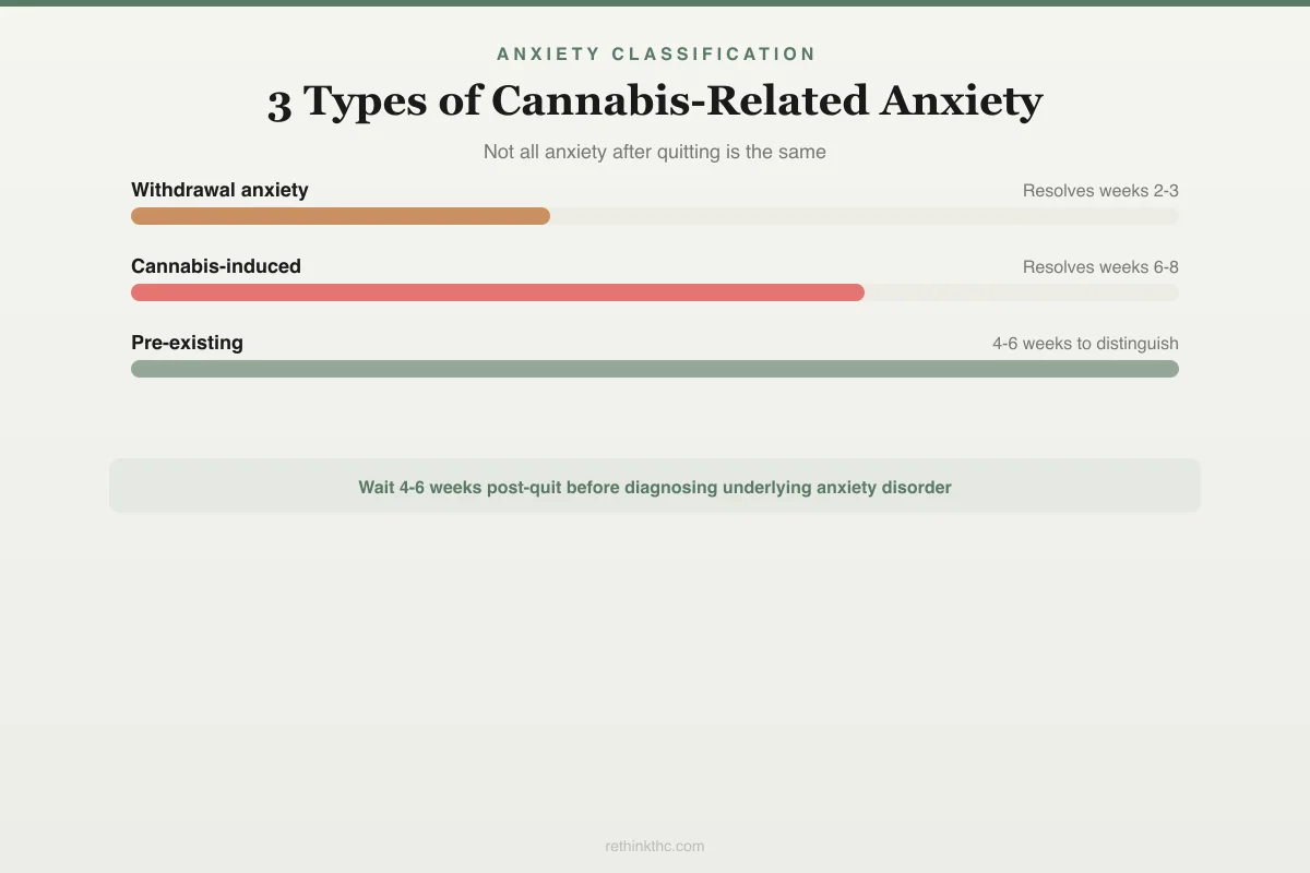 It comes with other withdrawal symptoms. Cannabis withdrawal is not just anxiety. It includes insomnia, irritability, loss of appetite, vivid dreams, sweating, and difficulty concentrating. If you are experiencing a cluster of these symptoms alongside anxiety, that is a withdrawal pattern, not an anxiety disorder pattern. A thorough look at the full symptom picture is covered in weed withdrawal anxiety.